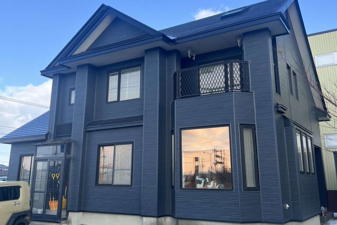 WORKS 施工事例 金属サイディング #苫小牧市 【苫小牧市 A様邸】ガルバリウム施工の事例 施工のポイント 出窓・柱などがある大きな御住宅ですが濃い色を使い引き締まった印象になりました。 Xでシェア Facebookでシェア URLをコピー